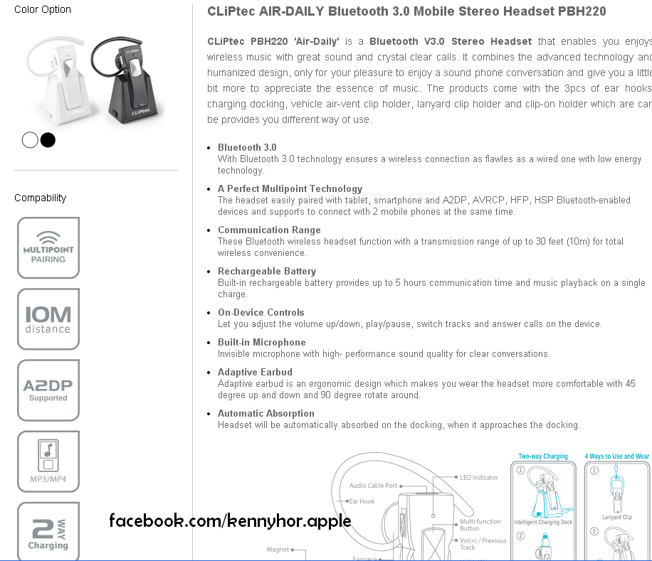 CLiPtec PBH220 V3.0的藍牙立體聲耳機,讓您享受無線音樂與出色的音質和清澈的電話。它結合了先進的技術和人性化的設計,享受完善的電話交談,並給你一點點的欣賞音樂的本質。該產品配備了耳鉤的3件,充電對接,車內空氣洩夾子夾,掛繩夾子夾和夾式固定器這是可以為您提供不同的使用方式。