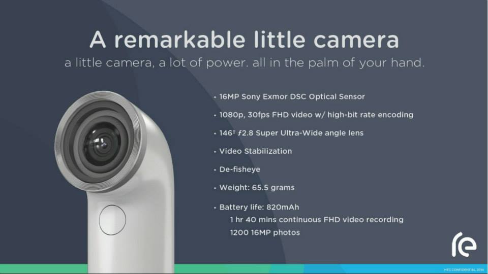在硬體規格上, HTC re Camera 配備 1/2.3 吋 1600 萬畫素背照式 COMS 感光元件,光圈 F2.8,廣角 146 度,其近拍的距離跟鄉民長度一樣都是 30 公分,可以進而提供很好的夜拍效果,續航力方面,可以支援連續拍攝 1 小時 50 分鐘,FHD 的影片,或是 1,200 張照片。